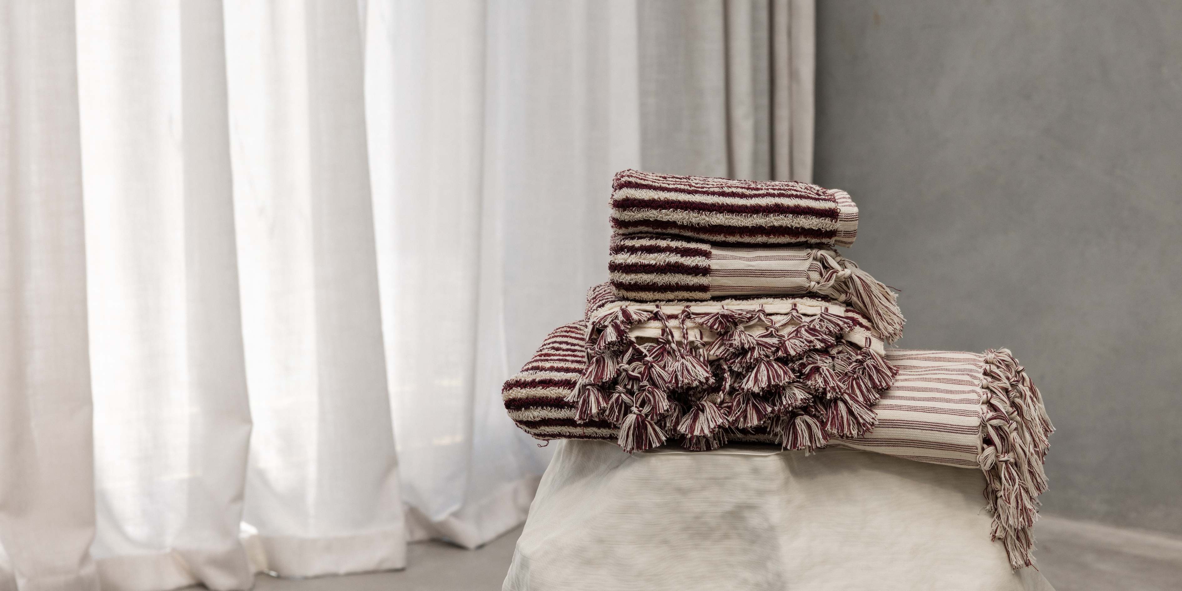 Introducing our newest addition, Burgundy Stripe. A rich mix of three Burgundy threads alongside a warm Ecru stripe. As always, this range has been handcrafted with care in Turkey.